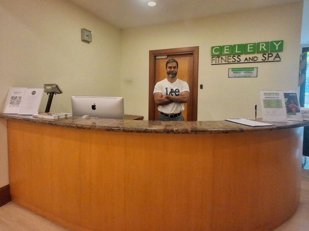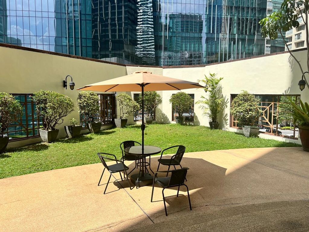 Outdoor seating beside the gym surrounded by lush greenery — a peaceful space to relax and recharge